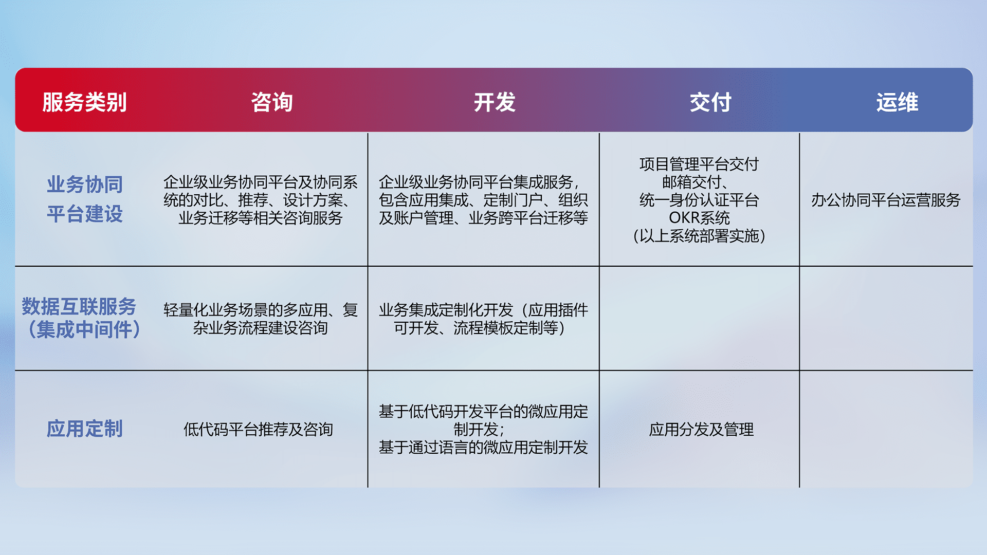 针对钉钉、、、、企微、、、IDaas等平台级产品提供产品的规划、、、、方案、、、、交付、、、、定制化开发等服务,,,实现如统一协同办公、、智能客户服务、、、混合会议管理、、智能数据查询、、等业务场景,,实现数字化转型。。。